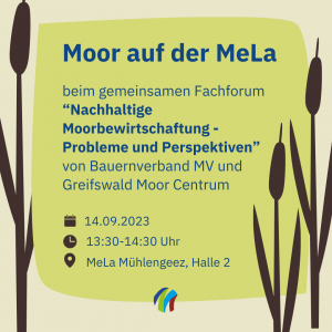 11/09/2023 Wie lässt sich nachhaltig wirtschaften auf #Moor? Gemeinsam thematisieren der Bauerrnverband M-V und Greifswald Moor Centrum die Probleme u Perspektiven bei einem gemeinsamen Fachforum auf der Landwirtschaftsmesse MeLa in Mühlengeez. Am Donnerstag von 13:30-14:30 Uhr am eingang von Halle 2 gibt es nach zwei kurzen Fachvorträgen Gelegenheit zu ausführlicher Diskussion über Probleme und Perspektiven der klimafreundlichen Nutzung nasser Moorböden.