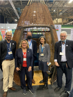„Hunderte von Delegierten und Beobachter*innen der Klimakonvention haben unsere riesige Moorkarte angesehen. Viele Länder wissen gar nicht, dass sie Moorböden besitzen. Ihre Vertreter nehmen aus Glasgow mit, dass Moore für den Klimaschutz wichtig sind. Unsere Präsenz hier war so effektiv, wie es Moore als Kohlenstoffspeicher sind.“, sagte Dr. Franziska Tanneberger, Leiterin des Greifswald Moor Centrum. Ein besonderes Highlight war ein von Moorexpert*innen der University of East London gebauter Wassertropfen aus Schilf und Weide, in dem ein Sofa stand – der wohl beliebteste Sitzplatz im ganzen Pavillon. Diese Konstruktion war für viele Besucher*innen ein beeindruckender Augenöffner, wozu Baumaterialien aus Paludikultur genutzt werden können.